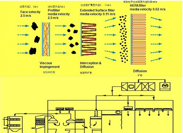 空調(diào)送風(fēng)系統(tǒng)通過一定的流速將灰塵送到過濾系統(tǒng)當(dāng)中,初級過濾器將5um以上大顆粒灰塵留在過濾表 面,中效過濾器將1um-5um顆粒抓取,高效過濾器將0.3um-0.5um以上灰塵顆粒過濾,從而保證無塵車間等級!