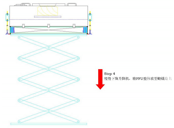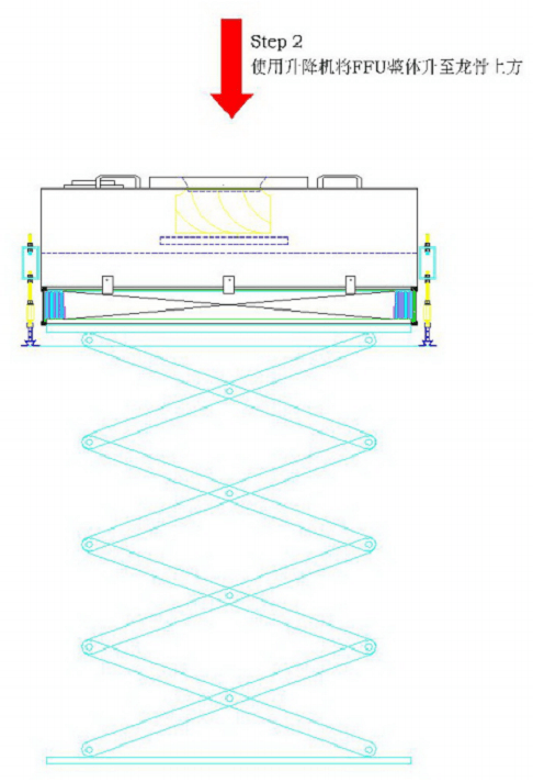 FFU安裝指導(dǎo)指南步驟2:將FFU整體放在升降機(jī)上,并調(diào)節(jié)升降機(jī)位置,使升降機(jī)上FFU整體處于FFU龍骨中心位置;使用升降機(jī)慢慢將FFU整體升至FFU龍骨正上方。