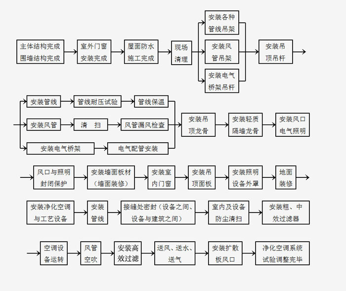 3、凈化工程設(shè)計應(yīng)為施工安裝、維護(hù)管理、測試和安全運行創(chuàng)造必要的條件。