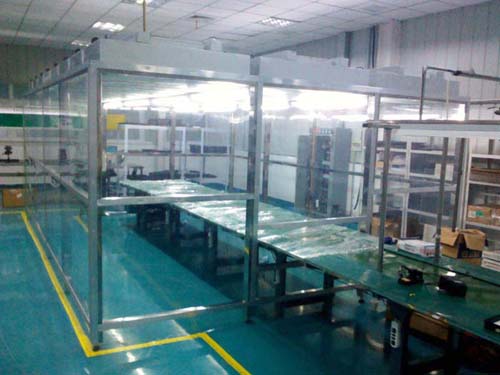 潔凈棚采用工業(yè)鋁材(或不銹鋼方通、鐵方通噴塑)作為框架,風機濾網(wǎng)機組(FFU)送風,四周懸掛防靜電垂簾(或鋼化玻璃),其內(nèi)部凈化級別可達到100-10000級。適用于操作區(qū)內(nèi)局部凈化級別要求高的區(qū)域。