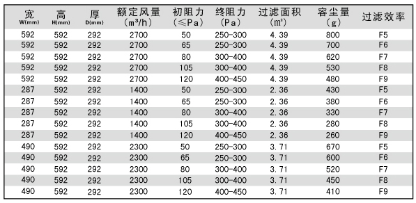 箱式中效過濾器技術(shù)參數(shù)