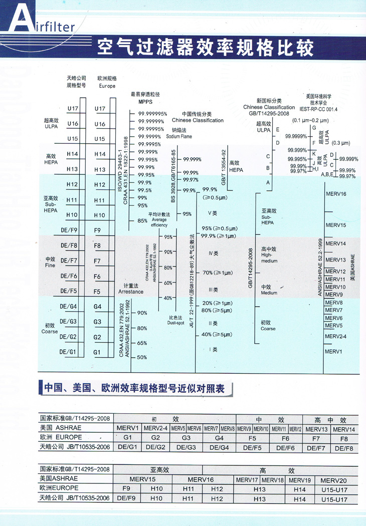國內外最新空氣過濾器效率規(guī)格表包括國標,美標,歐標三種國際標準
